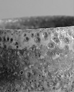 Shino glaze emerged in the 16th century in Japan during the Momoyama period (1568–1600). It is identified by thick white glazes, red scorch marks, and a texture of small holes.
