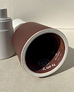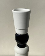 Vase made by different elements, hand-turned with some parts realised using the casting technique in white clay. White glaze, brown and black matte